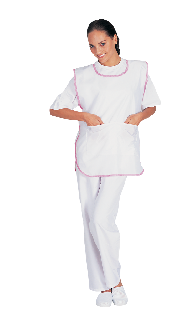 kolsuz, üstten giymeli, yarım, kenarları Pembe biyeli, önünde büyük 2 ceplidir.Pantolon, beyaz alpaka kumaştan önü