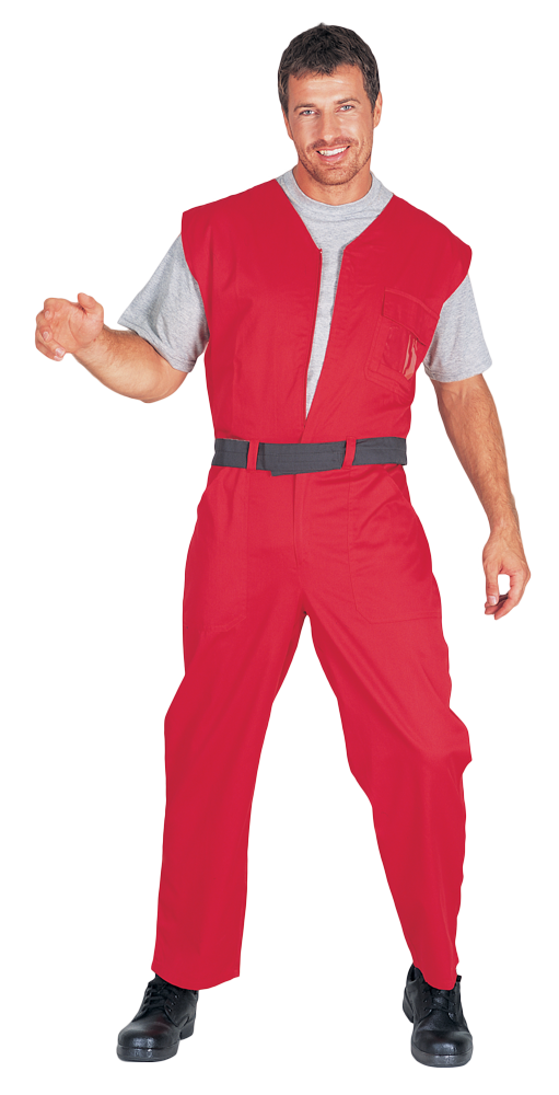 245gr Kırmızı %35 Pamuk/%65 Polyester harmandan karışım Gabardin kumaştan kolsuz Kapalı Tulum. Sıfır Yaka , önü fermuarlı, üst sol göğüs kapaklı üstten takma cepli, altta üstten takma 2 cepli, arkada kapaksız , toplam 4 cepli Tulum. Beli arkadan lastiklidir. Gerekli yerlerde ponteriz dikişleri bulunmaktadır.