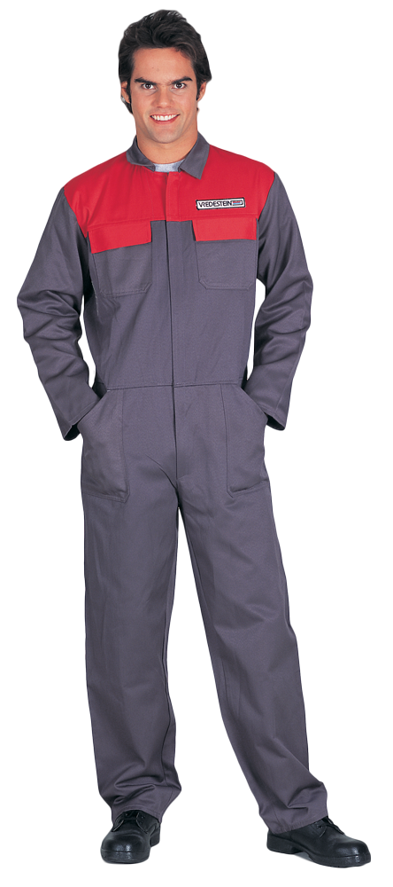 245gr Koyu gri %35 Pamuk / % 65 Polyester Harmandan Karışım Gabardin kumaştan Kapalı Tulum. Yakalı, önü spatlı fermuarlı, üst göğüs kırmızı kumaş kapaklı 2 cepli, altta üstten takma 2 cepli, arkada kapaksız , toplam 5 cepli , üst göğüs Kırmızı Gri kumaştan robalı Tulum. Beli arkadan lastiklidir. Yanda mezura cebi vardır. Gerekli yerlerde ponteriz dikişleri bulunmaktadır.